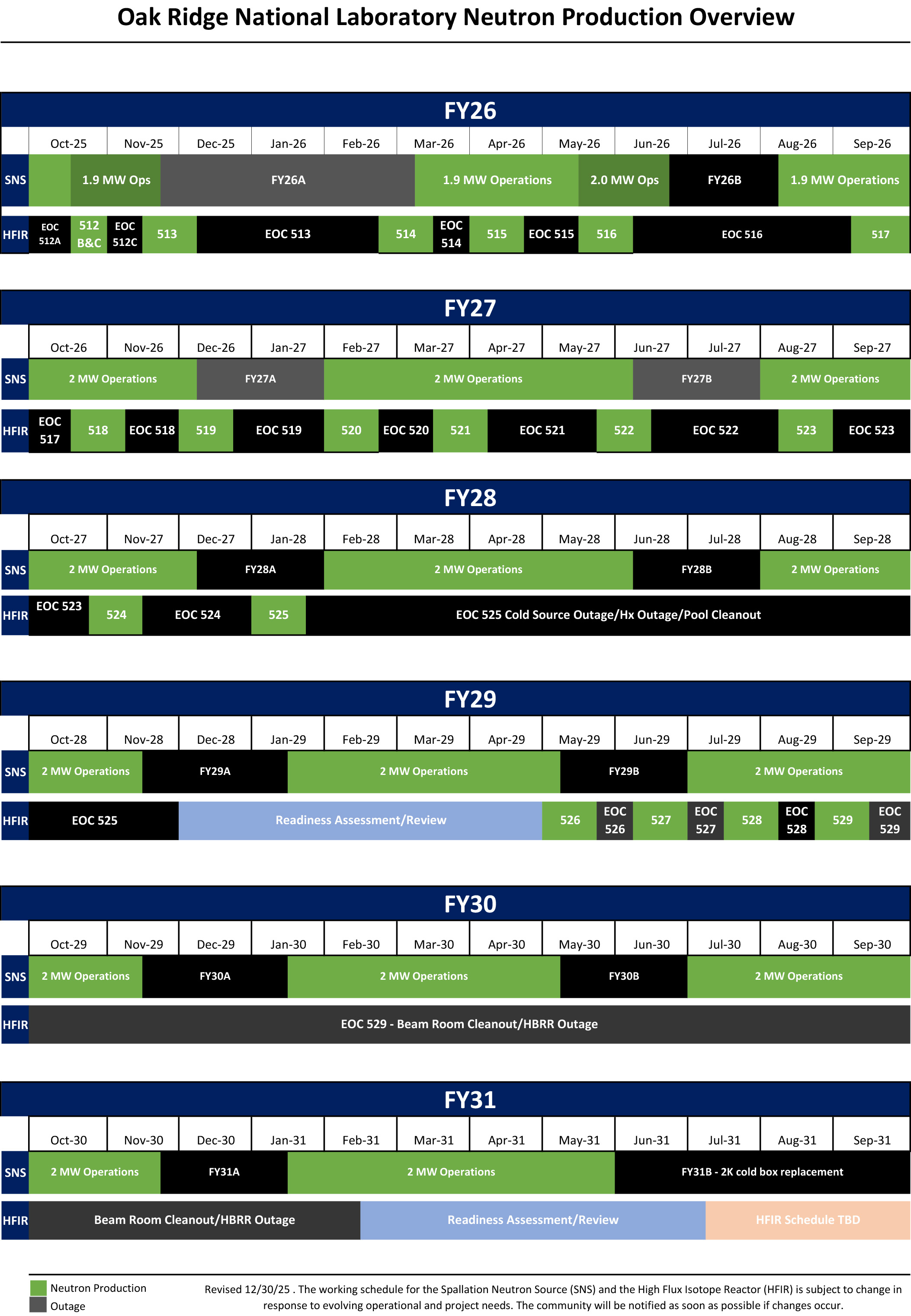The 5-year working schedule for the Spallation Neutron Source (SNS) and the High Flux Isotope Reactor (HFIR) is subject to change in response to evolving operational and project needs. The community will be notified as soon as possible if changes occur. (Last updated December 30, 2025)