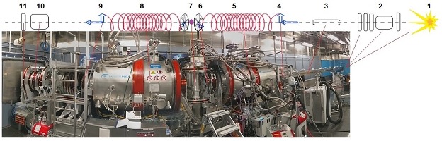 1 = neutron source; 2 = choppers-bender-polarizer-secondary shutter system; 3 = beam transport guides; 4 = pi/2 flipper for first 90° spin-turn; 5 = first precession zone; 6 = pi flipper for 180° spin-rotation; 7 = sample area and sample environment (cryo-furnace is shown here); 8 = second precession zone; 9 = pi/2 flipper for second 90° spin-turn; 10 = analyzer; 11 = detector.